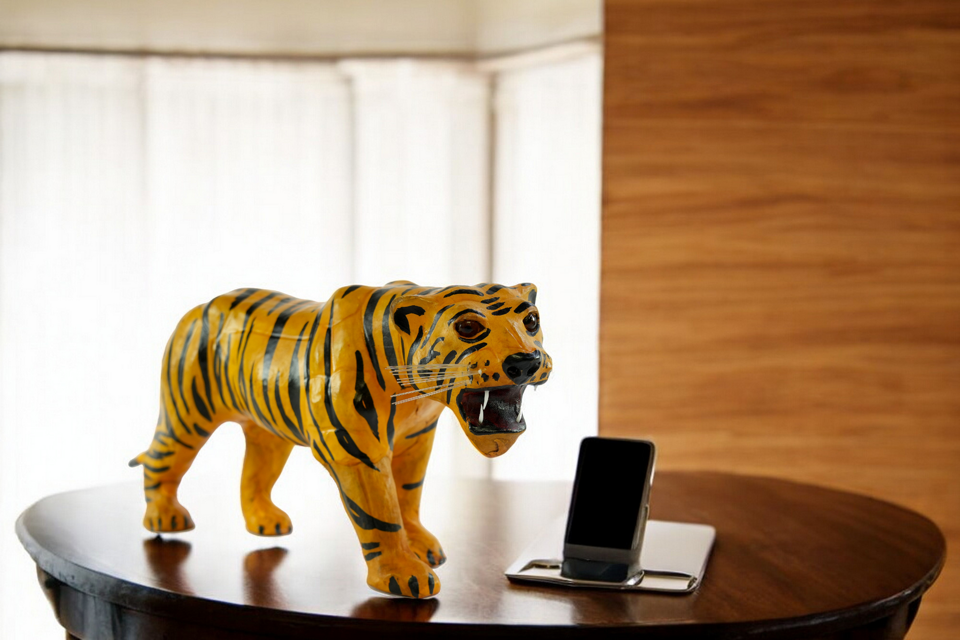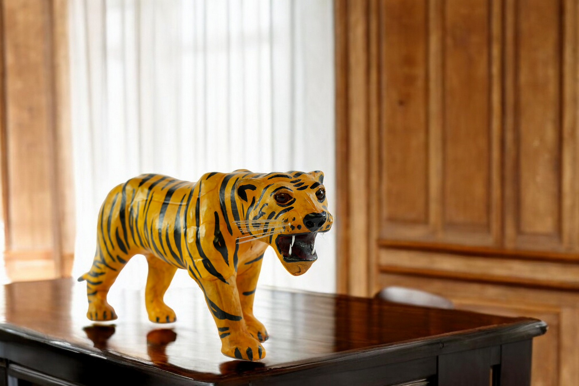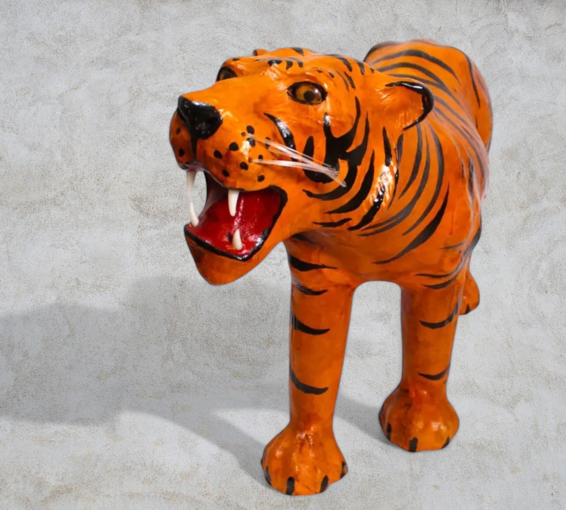 This handcrafted leather tiger sculpture is a bold and captivating piece of decor that embodies the strength and beauty of the jungle's most iconic predator. With its striking stripes, lifelike details, and a fierce pose, this tiger exudes power and confidence. Each sculpture is skillfully crafted by artisans, with every detail carefully hand-finished to highlight the tiger's majestic presence. Perfect as a centerpiece for your home or office, this unique piece is an excellent choice for those who appreciate wildlife-inspired artistry and decor.